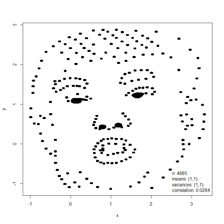 In this example these images had similar summary statistics from the outset and therefore the appearance of the dino dataset has changed little. Otherwise, the first dataset will be deformed but its general shape will still be recognisable.