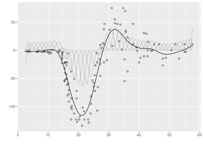 Below is an illustration of the A-spline procedure using the helmet data. The thick line represents the fitted spline and the thin line represents the B-spline basis decomposition of the fitted curve.