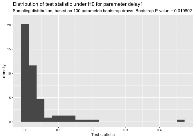 Inference on the model parameters is possible through confint for bootstrap confidence intervals and delay_test for parameter comparisons in a two group setting.