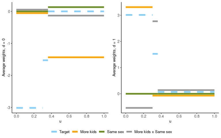 Since the propensity score model is simply morekids ~ samesex, and samesex is a binary variable, there are only two values of the propensity score. These two values partition the unit interval into three regions, and the average weights will vary across these three regions. These propensity scores can be recovered from the column ub in any of the matrices constructed above.