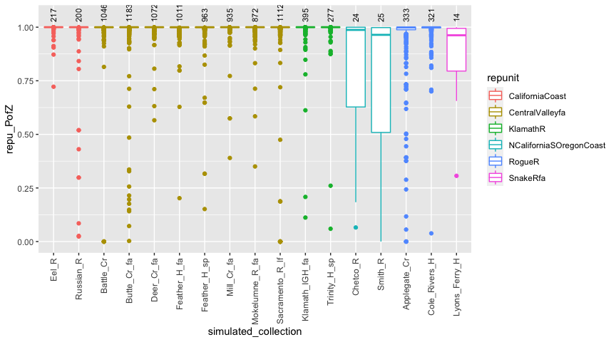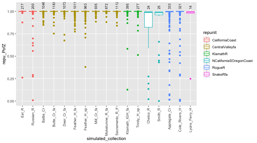 #> 17 SnakeRfa Lyons_Ferry_H 9.61e-3 0.00961 1In the fisheries world, “100% simulations” have been a staple. In
