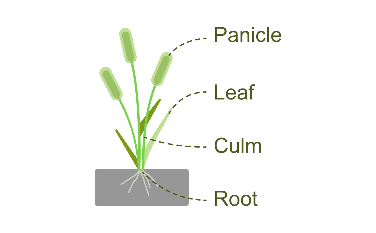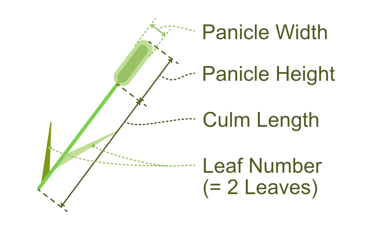 The data contains of 54 branches across 10 Setaria viridis plants. Setaria viridis consists of 4 parts: panicle, leaf, culm, and root, as illustrated in the figure below: