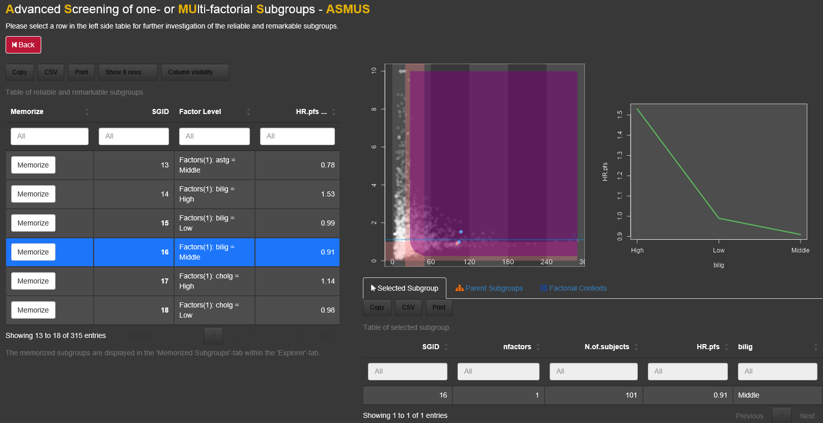 ASMUS is a feature which guides the user of the Subgroup Explorer through the screening of tens of thousand of subgroups with the aim to find those which are worth pursuing. The key of ASMUS is to focus on assessable subgroups only. This reduces the number of subgroups to be considered drastically. A fuzzy logic approach is used to select subgroups which have a remarkable treatment effect and which provide reliably information. An expert in pharmacology can then decide whether the subgroup defining factors explain the treatment effect reasonably.