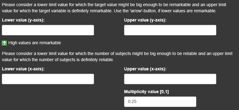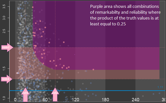 The truth value for the remarkability of the treatment effect and the truth value for the reliability of the provided information are combined with a logical “and”. From the many proposal, which can be found in the literature, to calculate a logical “and” in fuzzy logic (minimum, algebraic product, drastic product, etc. ), we selected the algebraic product because it is simple and convex. The convexity is appreciated because a lower truth-value for the remarkability requires a compensation with a higher truth-value for the reliability and vice versa. The central question is when do the subgroup-defining factors explain the treatment effect reasonably. It can only be answered by experts in pharmacology.