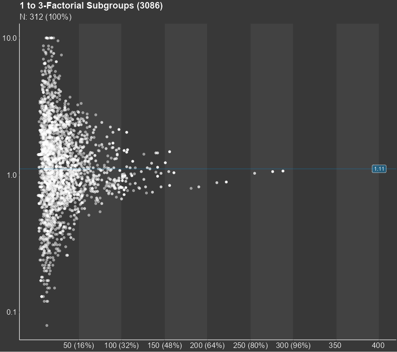 The central result of a subgroup screening is a diagram, in which each dot stands for a subgroup. The diagram can show thousands of them. The position of the dot in the diagram is determined by the sample size of the subgroup and the statistical measure of the treatment effect in the respective subgroup. The sample size is shown on the horizontal axis while the treatment effect is displayed on the vertical axis. Furthermore, the diagram shows the line of the overall study results. For small subgroups, which are found on the left side of the plot, larger random deviations from the mean study effect are expected, while the deviation from the study mean for larger subgroups tends to be smaller. Therefore, the dots in the figure are expected to form a funnel for studies with no conspicuous subgroup effects. Any deviations from this funnel shape may hint towards conspicuous subgroups.
