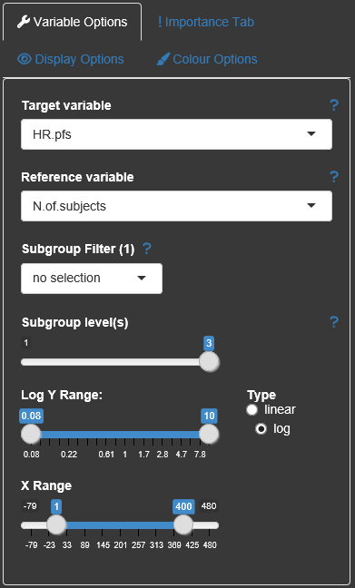 Within the Display options the user can change dot size and click/select radius. The dot size can be changed to be related to the number of subjects for each subgroup. The colour brigthness is also adjustable.
